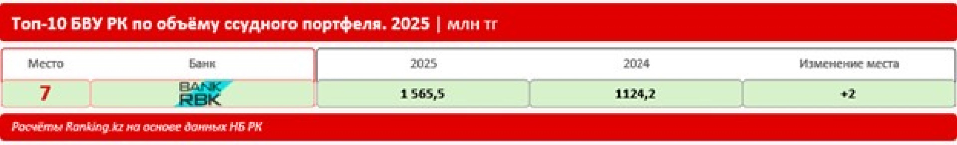 Bank RBK стал единственным банком, который улучшил свои позиции сразу на две строчки, увеличив ссудный портфель на 39,2 процента, что составило 1,6 триллиона тенге. Это один из лучших результатов среди ведущих банков страны.