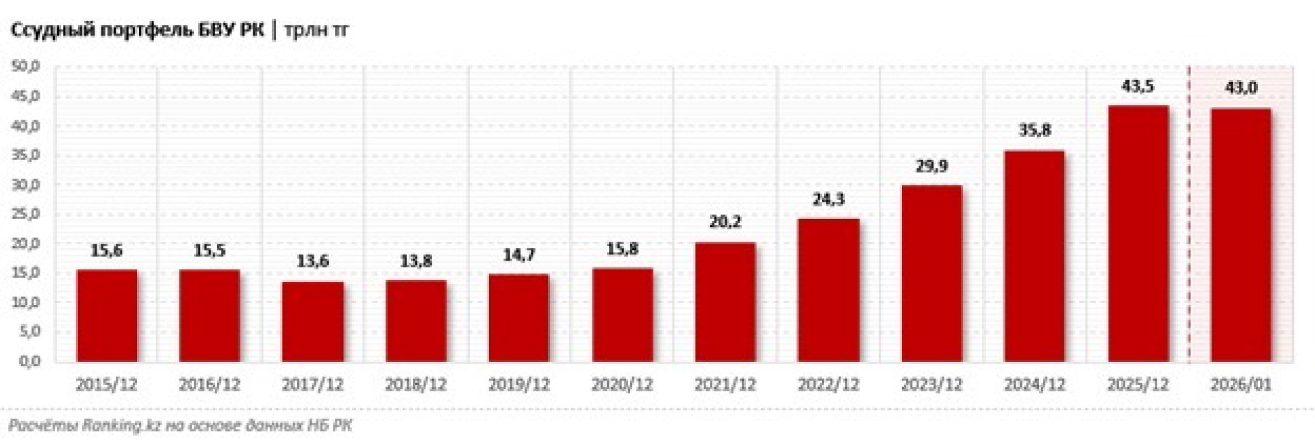 По итогам 2025 года Bank RBK совершил значительный скачок в рейтинге банков Казахстана, поднявшись с девятого на седьмое место по объему ссудного портфеля. Согласно данным Национального банка, общий размер ссудного портфеля банков второго уровня Казахстана достиг рекордных 43,5 триллиона тенге, увеличившись на 21,3 процента за год. За последние пять лет этот показатель вырос почти втрое.