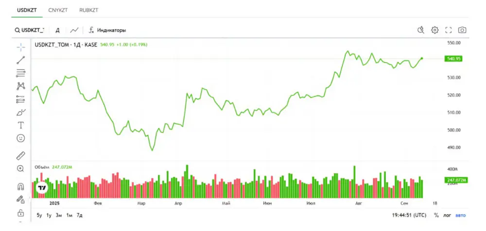 По итогам торгов на Казахстанской фондовой бирже (KASE, на 17:00 по времени Астаны) средневзвешенный курс доллара составил 540,84 тенге, увеличившись на 1,76 тенге. Официальный курс Национального банка на 12 сентября составляет 538,89 тенге за доллар.