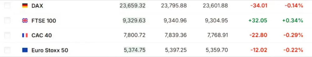 Европейские рынки в целом показывают отрицательную динамику, что обусловлено слабостью в определённых секторах, таких как здравоохранение и люксовые бренды. Политическая нестабильность во Франции, где существует опасение по поводу возможного понижения кредитного рейтинга, также добавляет напряжённости. Основные индексы DAX (-0,14%), CAC 40 (-0,29%) и Euro Stoxx 50 (+0,22%) находятся в минусе, в то время как FTSE 100 немного вырос на 0,34%.