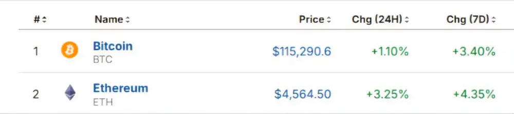 Курс Bitcoin (BTC) подрос на 1,10%, а Ethereum (ETH) увеличился на 3,25% до 4 564,50 долларов за монету. Слабая инфляция в США усиливает ожидания снижения ставок ФРС, что привлекает институциональные инвестиции в криптоактивы.